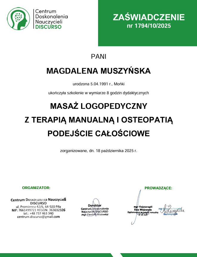 Moje kwalifikacje – potwierdzone certyfikatami/zaświadczeniami, które nieustannie zdobywam, by świadczyć opiekę na najwyższym poziomie.